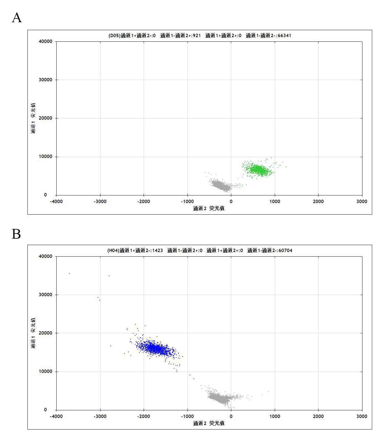 Figure 1. A:HCT116 Parental Cell;B:WRN[C727S](Homozygous,AF%:100) Isogenic HCT116 通道2 藍(lán)色微滴代表WRN[C727S]突變陽(yáng)性,通道2 綠色微滴代表該位點(diǎn)為陰性野生型