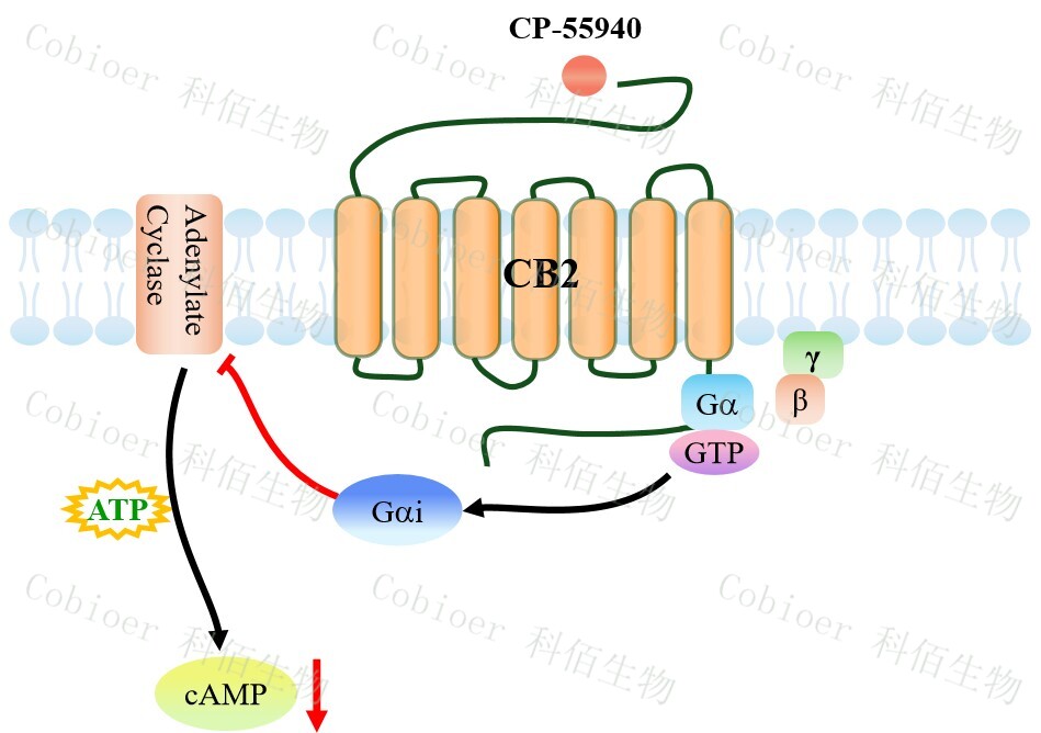 cAMP 在 G 蛋白偶聯(lián)受體(GPCR)信號(hào)轉(zhuǎn)導(dǎo)中是一種關(guān)鍵的第二信使。當(dāng)配體結(jié)合到 GPCR,構(gòu)象發(fā)生變化,激活受體接著激活 G 蛋白,Gi 的激活導(dǎo)致腺苷酸環(huán)化酶調(diào)控 cAMP 的下調(diào)。CB2 CHO 藥靶模型很好的模擬了體內(nèi) CB2 的信號(hào)轉(zhuǎn)導(dǎo)過程,原理見下圖所示。