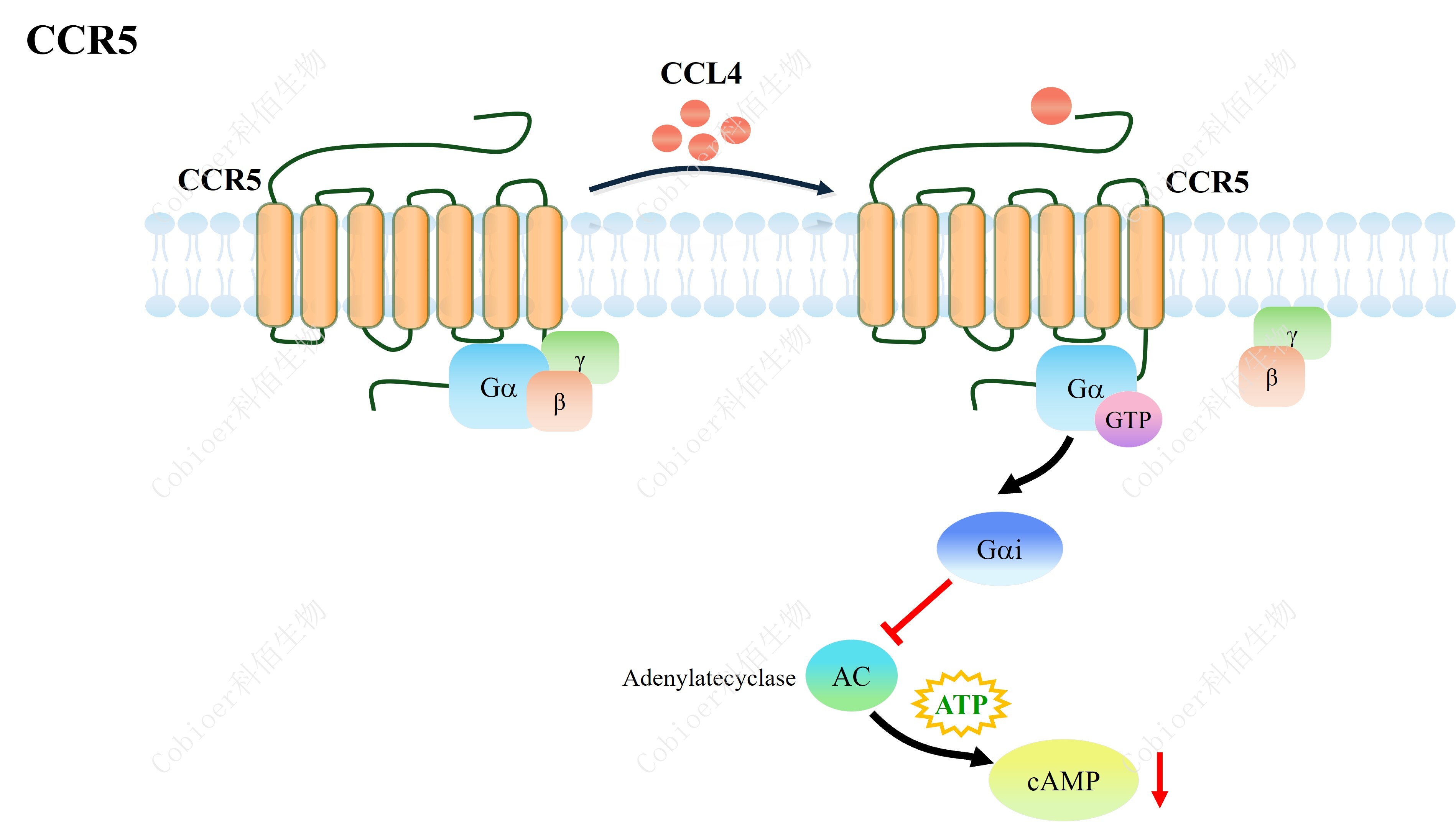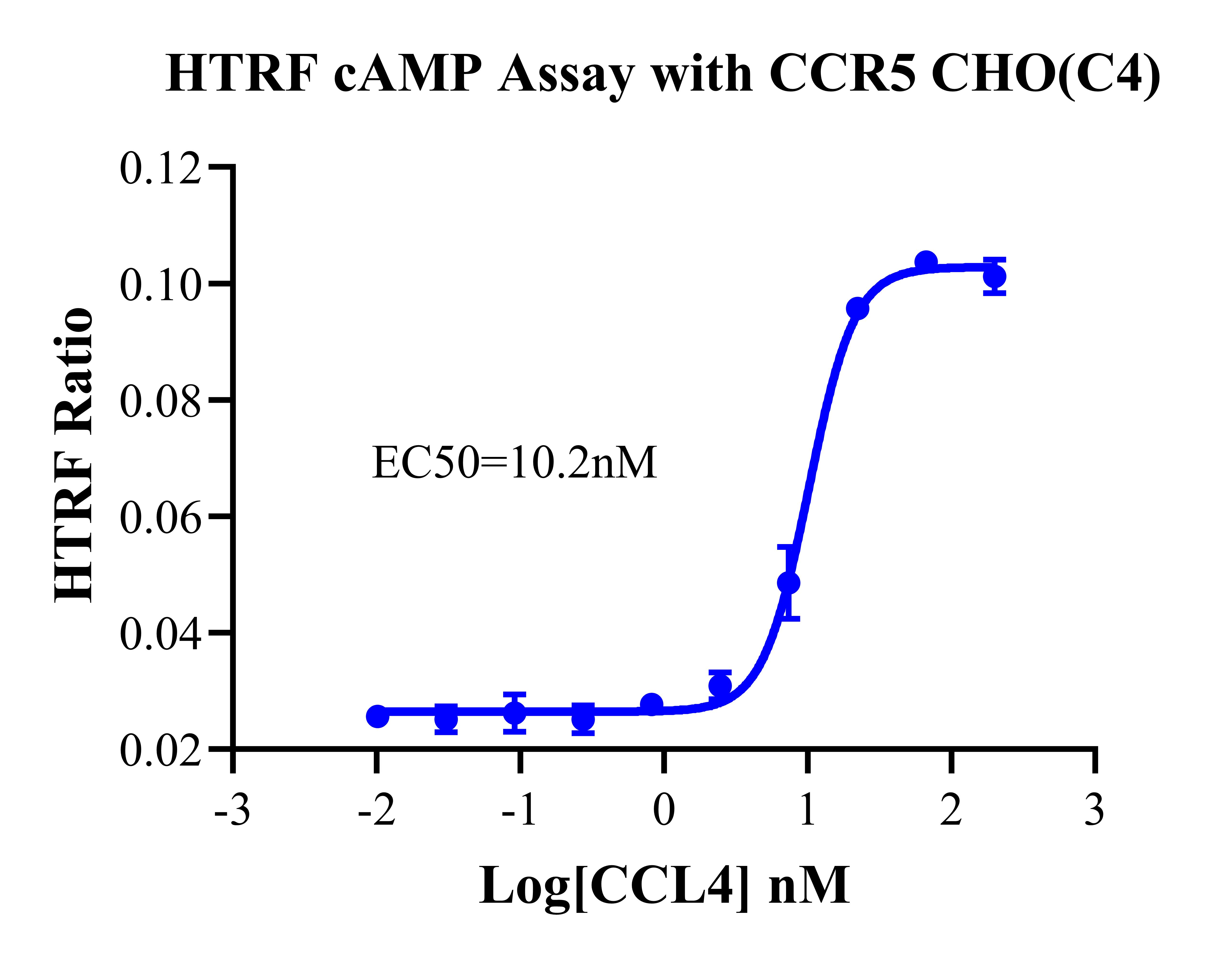 cAMP 在 G 蛋白偶聯(lián)受體(GPCR)信號轉(zhuǎn)導(dǎo)中是一種關(guān)鍵的第二信使。當(dāng)配體結(jié)合到 GPCR,構(gòu)象發(fā)生變化,激活受體接著激活G蛋白,Gi的激活導(dǎo)致腺苷酸環(huán)化酶調(diào)控 cAMP 的下調(diào)。CCR5 藥靶模型很好的模擬了體內(nèi) CCR5 的信號轉(zhuǎn)導(dǎo)過程,原理見下圖所示。![]() Figure 1. CCR5 CHO 細(xì)胞模型原理圖