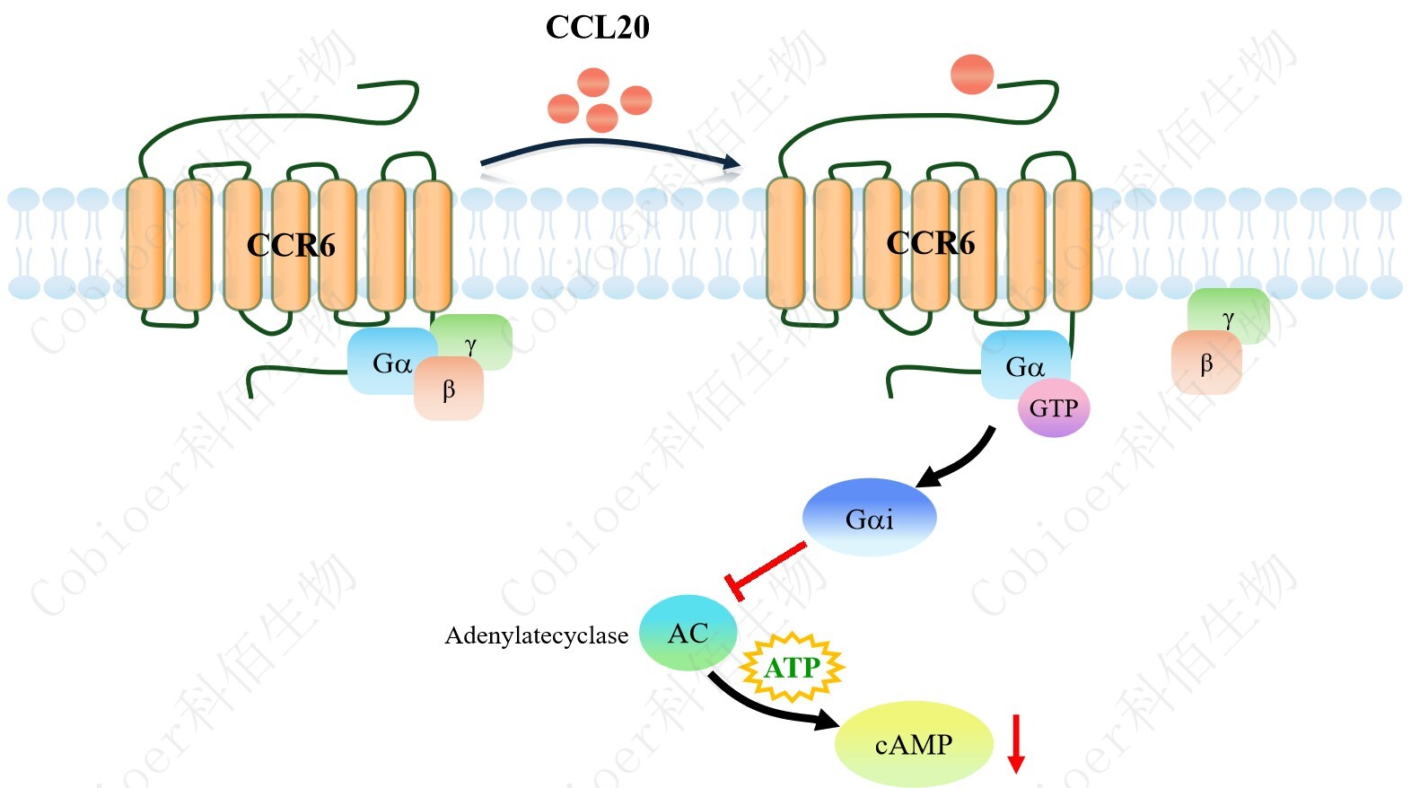 cAMP 在 G 蛋白偶聯(lián)受體(GPCR)信號(hào)轉(zhuǎn)導(dǎo)中是一種關(guān)鍵的第二信使。當(dāng)配體結(jié)合到 GPCR,構(gòu)象發(fā)生變化,激活受體接著激活 G 蛋白,Gi 的激活導(dǎo)致腺苷酸環(huán)化酶調(diào)控 cAMP 的下調(diào)。CCR6 藥靶模型很好的模擬了體內(nèi) CCR6 的信號(hào)轉(zhuǎn)導(dǎo)過程,原理見下圖所示。