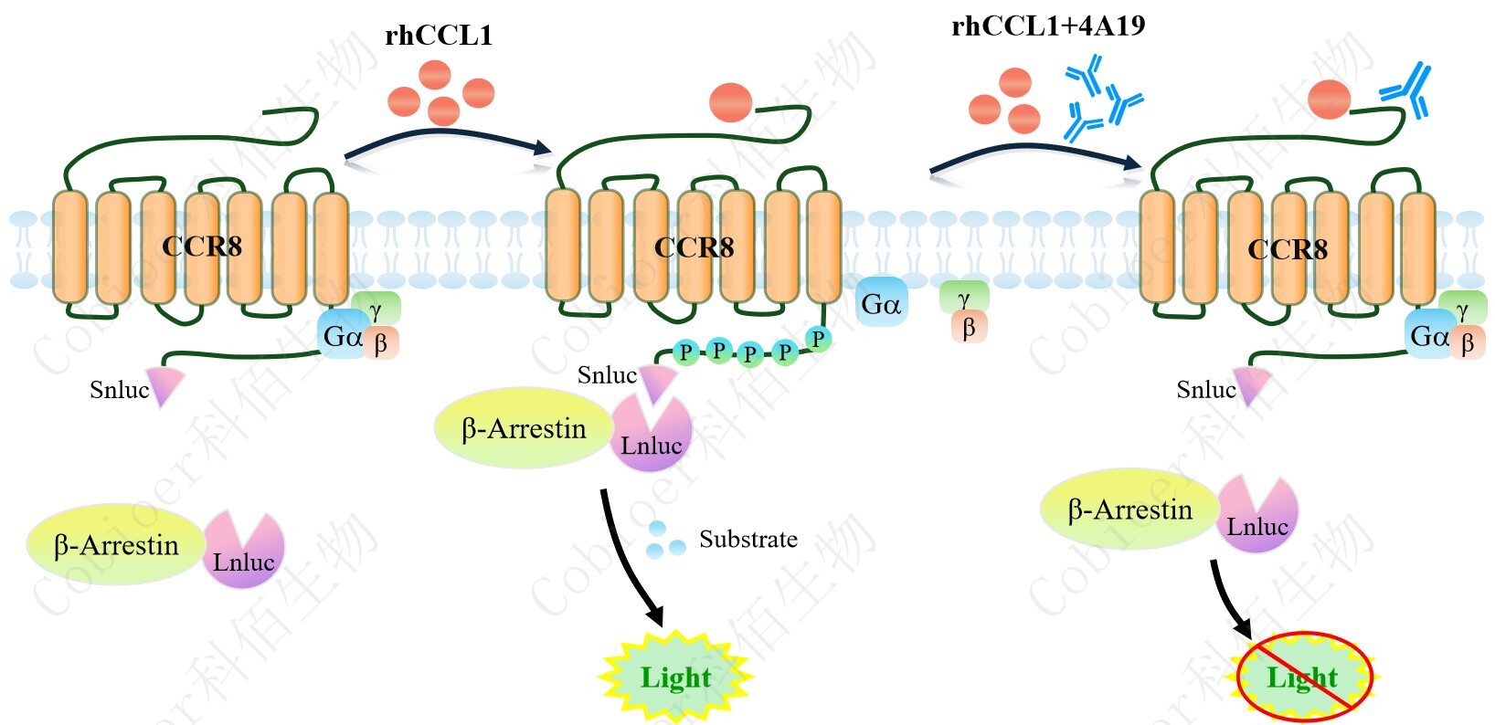 CCR8 β-Arrestin CHO 報告基因藥靶模型很好的模擬了體內(nèi) CCR8/β-Arrestin 的信號轉(zhuǎn)導(dǎo)過程,原理見下圖所示。當缺乏配體刺激時,β-Arrestin 不與 CCR8 結(jié)合,融合β-Arrestin的熒光素酶處于失活構(gòu)象,當 CCR8 遭遇配體刺激時,融合熒光素酶報告基因的β-Arrestin被招募,使熒光素酶報告基因處于激活狀態(tài),加入其底物后發(fā)光信號增強。