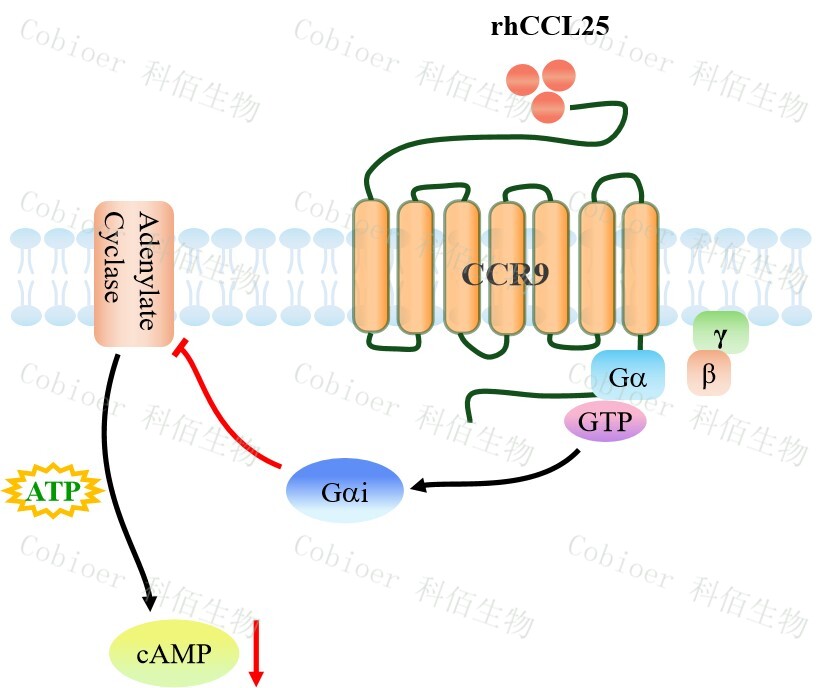 cAMP 在 G 蛋白偶聯(lián)受體(GPCR)信號轉(zhuǎn)導中是一種關鍵的第二信使。當配體結(jié)合到 GPCR,構(gòu)象發(fā)生變化,激活受體接著激活 G 蛋白,Gi 的激活導致腺苷酸環(huán)化酶調(diào)控 cAMP 的下調(diào)。CCR9 藥靶模型很好的模擬了體內(nèi) CCR9 的信號轉(zhuǎn)導過程,原理見下圖所示。通路。![]() Figure 1. CCR9 CHO 細胞模型原理圖 |