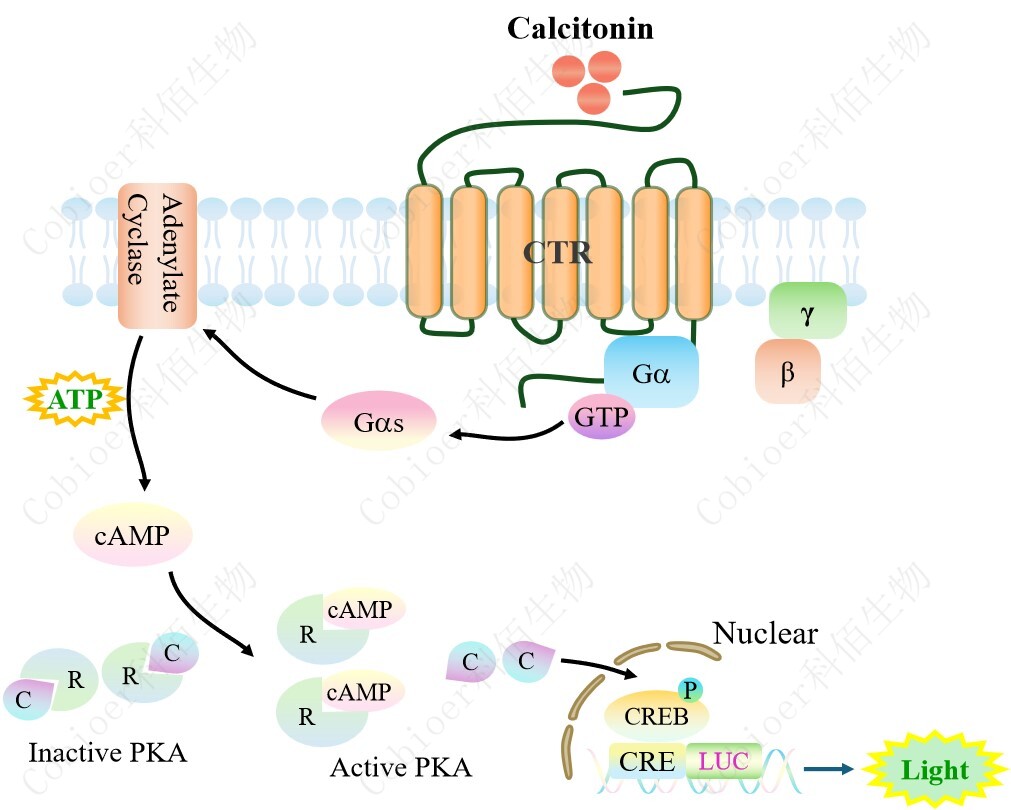 CTR(CALCR) CRE-Luc HEK293 報告基因藥靶模型很好的模擬了體內(nèi) CTR 的信號轉(zhuǎn)導(dǎo)過程,原理見下圖所示。
