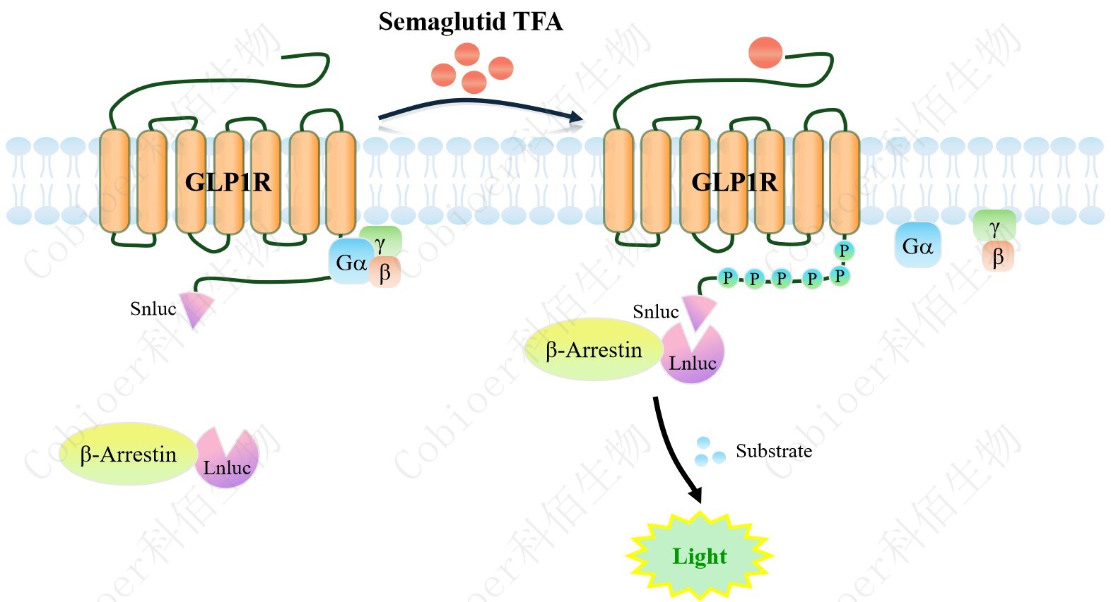 GLP1R β-Arrestin CHO 報告基因藥靶模型很好的模擬了體內(nèi) GLP1R/β-Arrestin 的信號 轉(zhuǎn)導(dǎo)過程,原理見圖 2 所示。當缺乏配體刺激時,β-Arrestin 不與 GLP1R 結(jié)合,融合β- Arrestin 的熒光素酶處于失活構(gòu)象,當 GLP1R 遭遇配體刺激時,融合熒光素酶報告基因的 β-Arrestin 被招募,使熒光素酶報告基因處于激活狀態(tài),加入其底物后發(fā)光信號增強。 Figure 1. GLP1R β-Arrestin CHO 細胞模型原理圖
