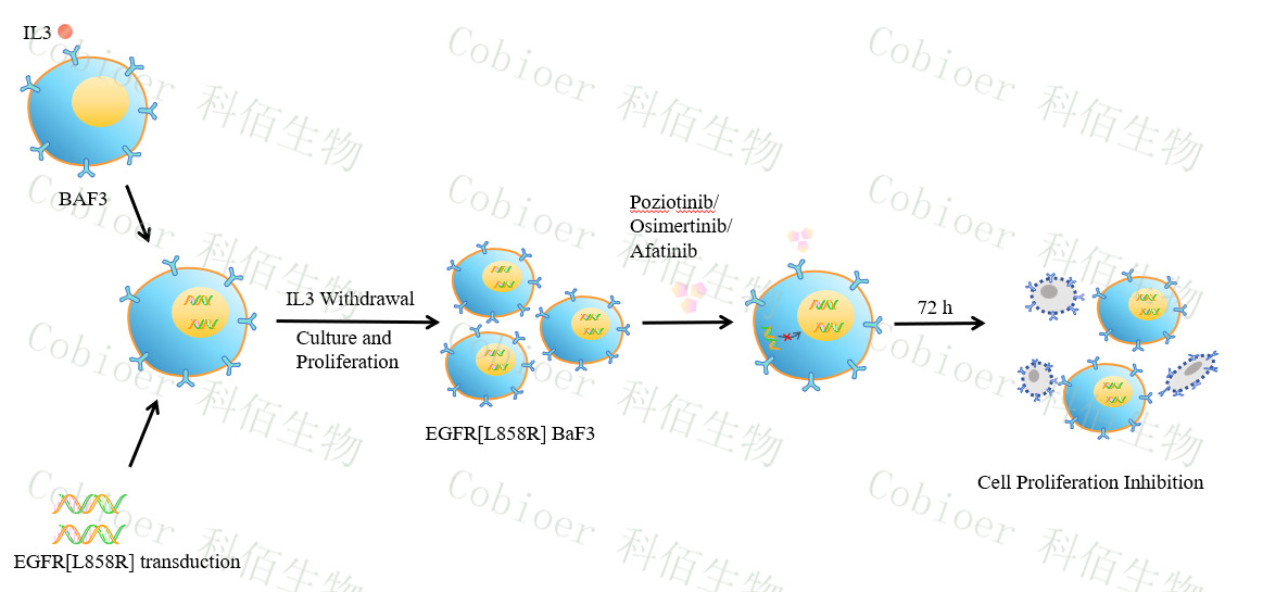 BaF3(小鼠原 B 細胞)的生長和增殖需要 IL-3 的維持。通過引入各種表達激酶的基因, 能作為 BaF3 的驅動基因,讓 BaF3 不再依賴 IL-3 而增殖,進而激酶基因成為 BaF3 增殖依 賴的驅動基因,用于評估小分子藥物對激酶的靶向抑制作用,原理及流程見下圖所示。
