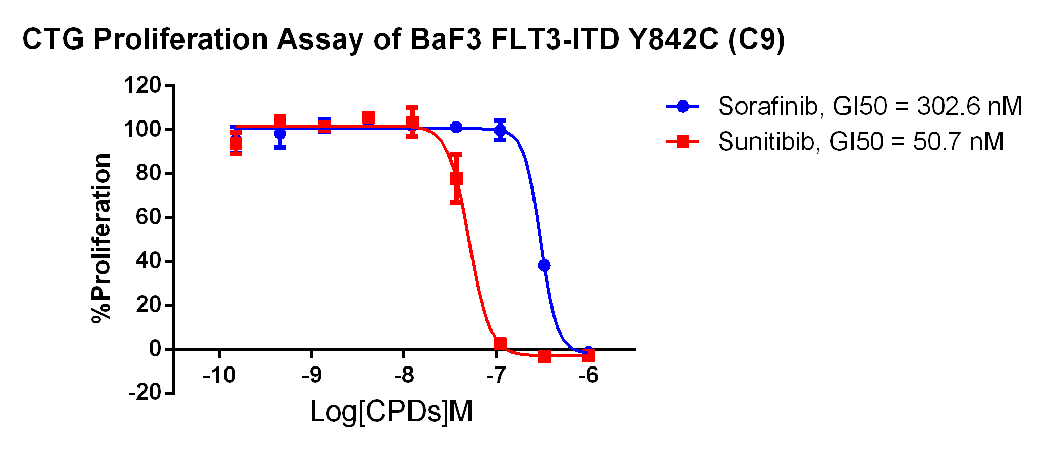 Figure 2. Anti-proliferation assay of two reference compounds on the FLT3-ITD [Y842C]/BaF3 Stable Cell Line.