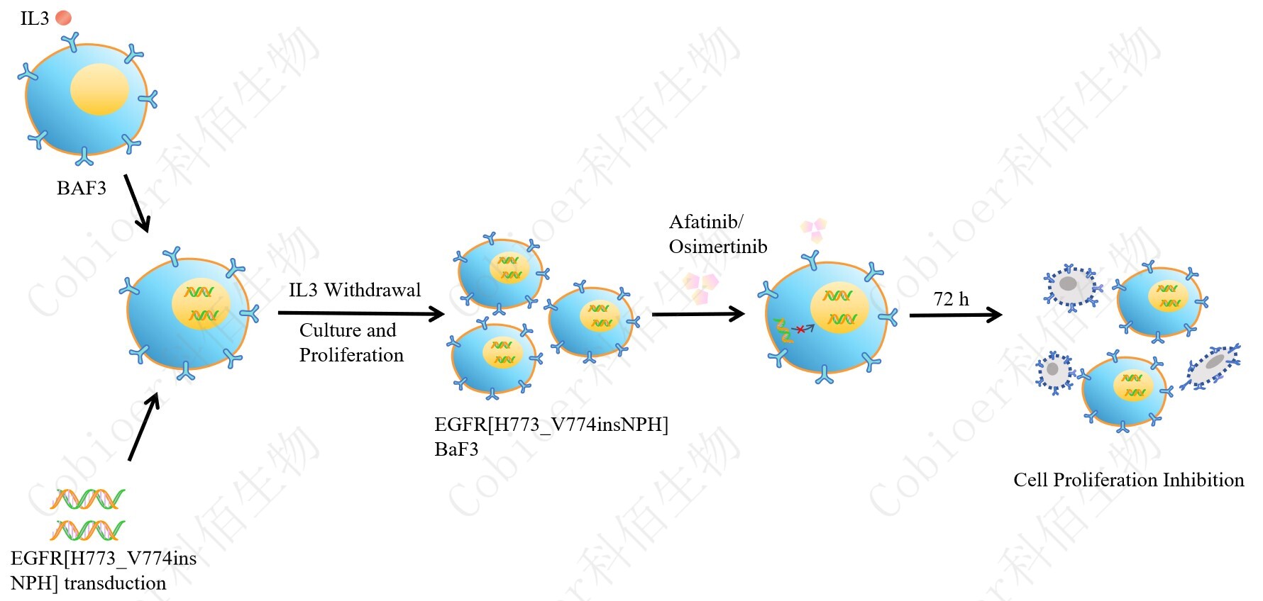 BaF3(小鼠原 B 細胞)的生長和增殖需要 IL-3 的維持。通過引入各種表達激酶的基因, 能作為 BaF3 的驅(qū)動基因,讓 BaF3 不再依賴 IL-3 而增殖,進而激酶基因成為 BaF3 增殖依 賴的驅(qū)動基因,用于評估小分子藥物對激酶的靶向抑制作用,原理及流程見下圖所示。![]() Figure 1. EGFR[H773_V774insNPH] BaF3 細胞的構(gòu)建原理圖 |