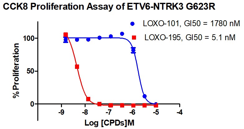 2.Anti-proliferation assay Figure 3. Anti-proliferation assay of two reference compounds on the ETV6-NTRK3-G623R/BaF3 Stable Cell Line. |