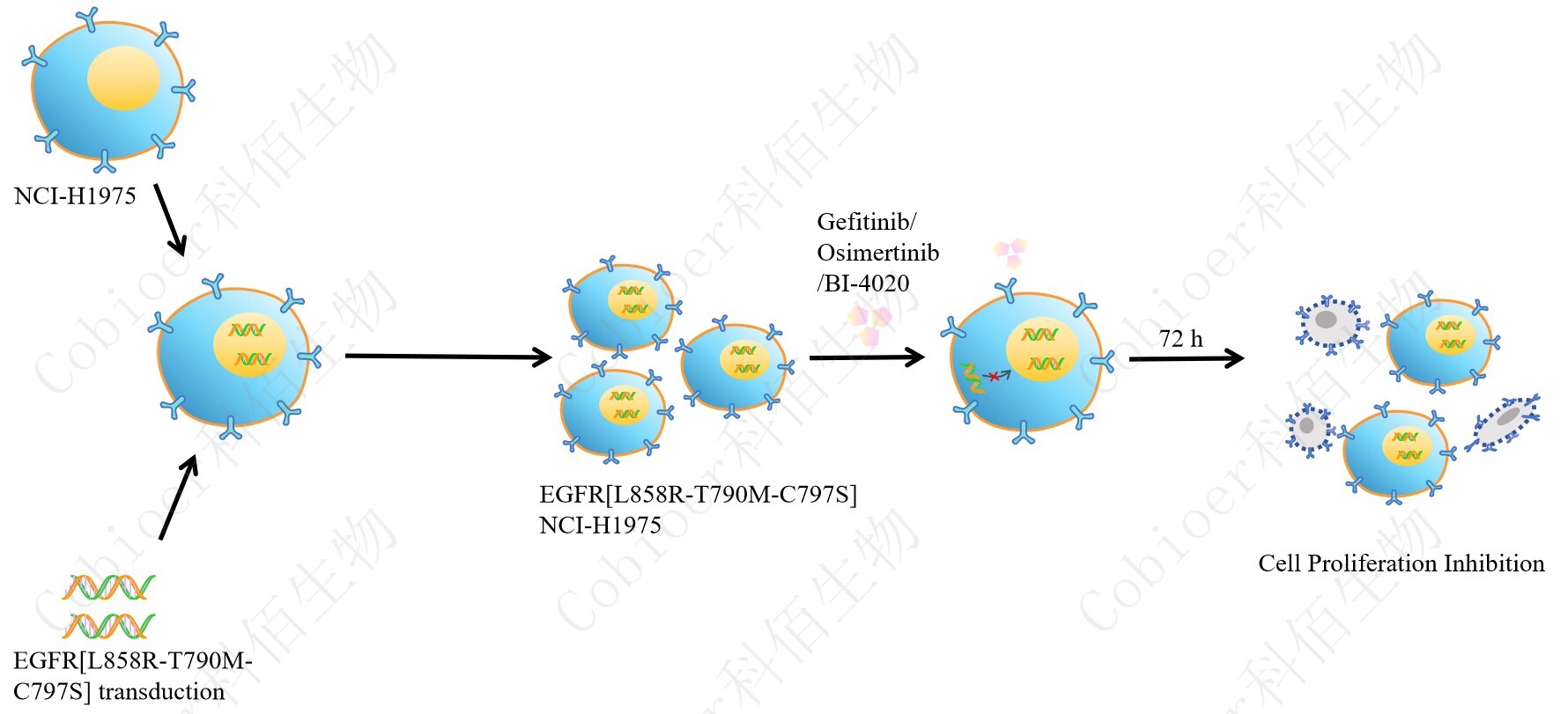 EGFR[L858R-T790M-C797S] NCI-H1975 藥靶細(xì)胞,通過(guò)轉(zhuǎn)導(dǎo)突變狀態(tài) 的 EGFR[L858R-T790M-C797S]基因到 NCI-H1975 細(xì)胞系中,穩(wěn)定表達(dá)人突變形態(tài)下的 EGFR[L858R-T790M-C797S]基因,原理及流程見(jiàn)下圖所示。![]() Figure 1. EGFR[L858R-T790M-C797S] NCI-H1975 細(xì)胞的構(gòu)建原理圖 |
