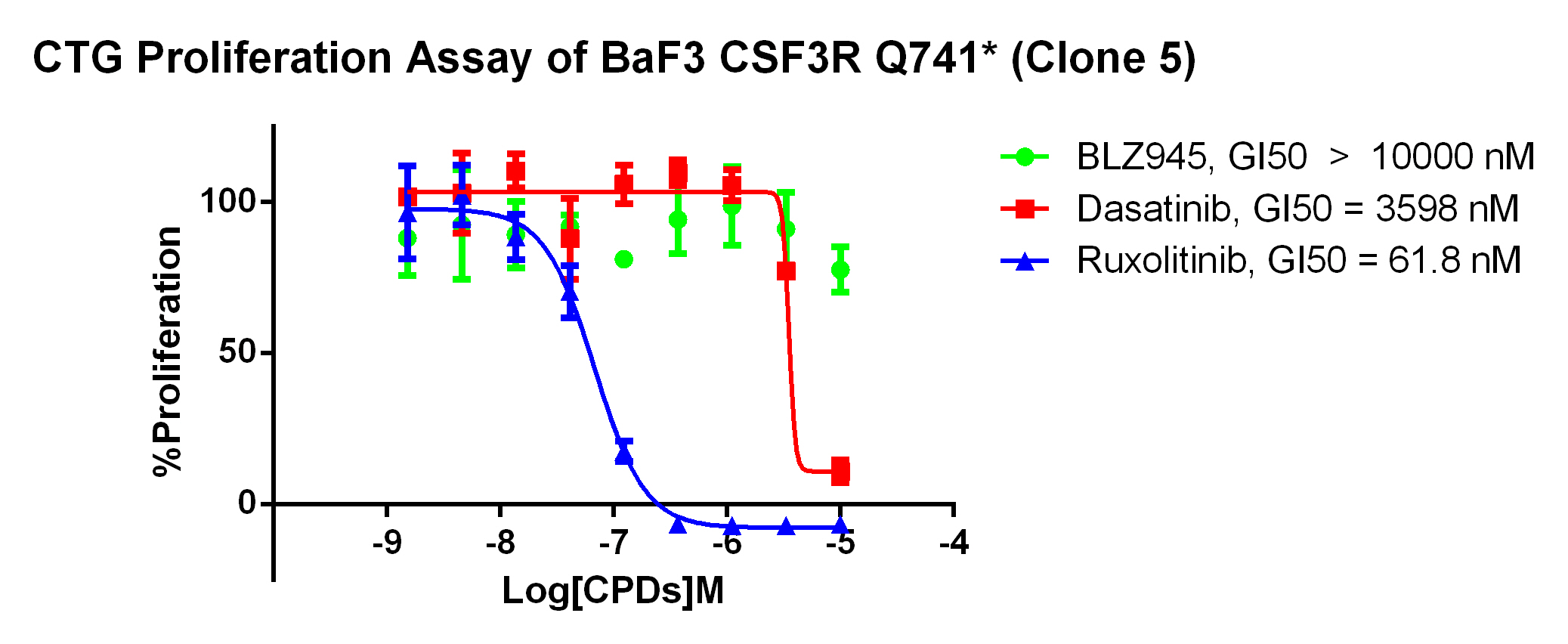 Figure 2. Anti-proliferation assay of three reference compounds on the CSF3R Q741/BaF3.