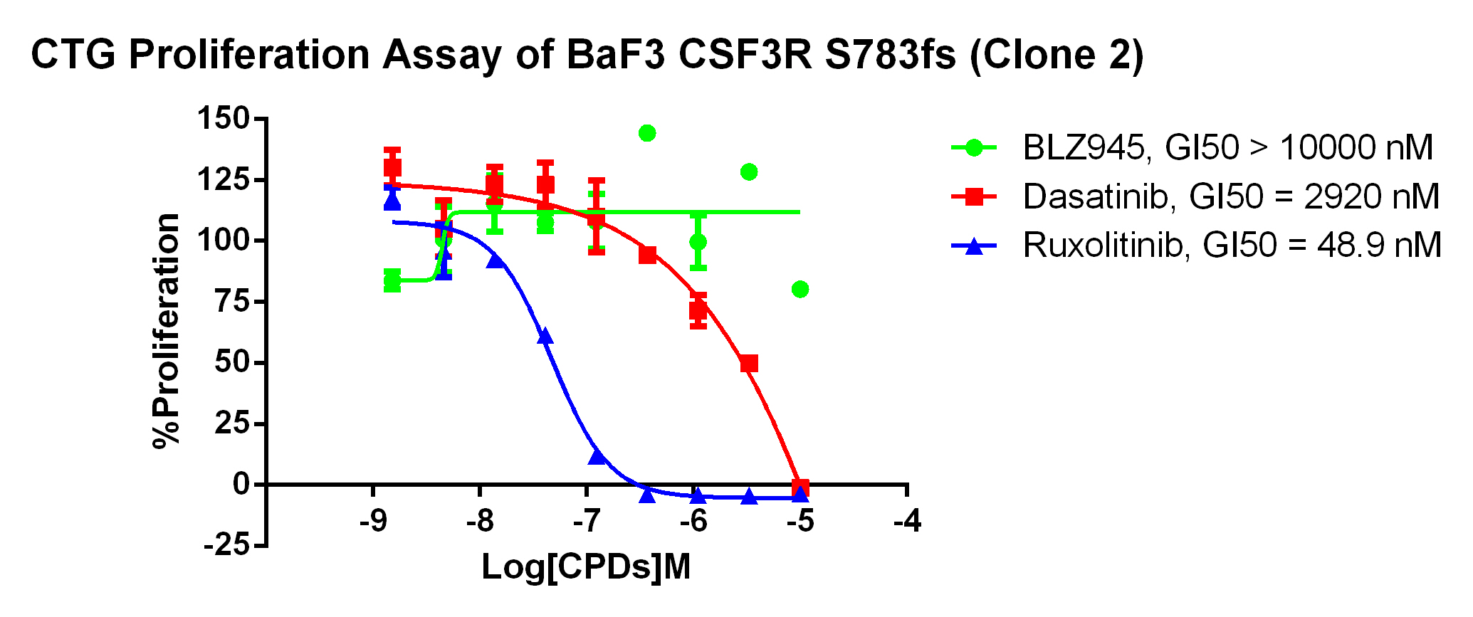 2. Anti-proliferation assay Figure 2. Anti-proliferation assay of three reference compounds on the CSF3R S783fs/BaF3. |