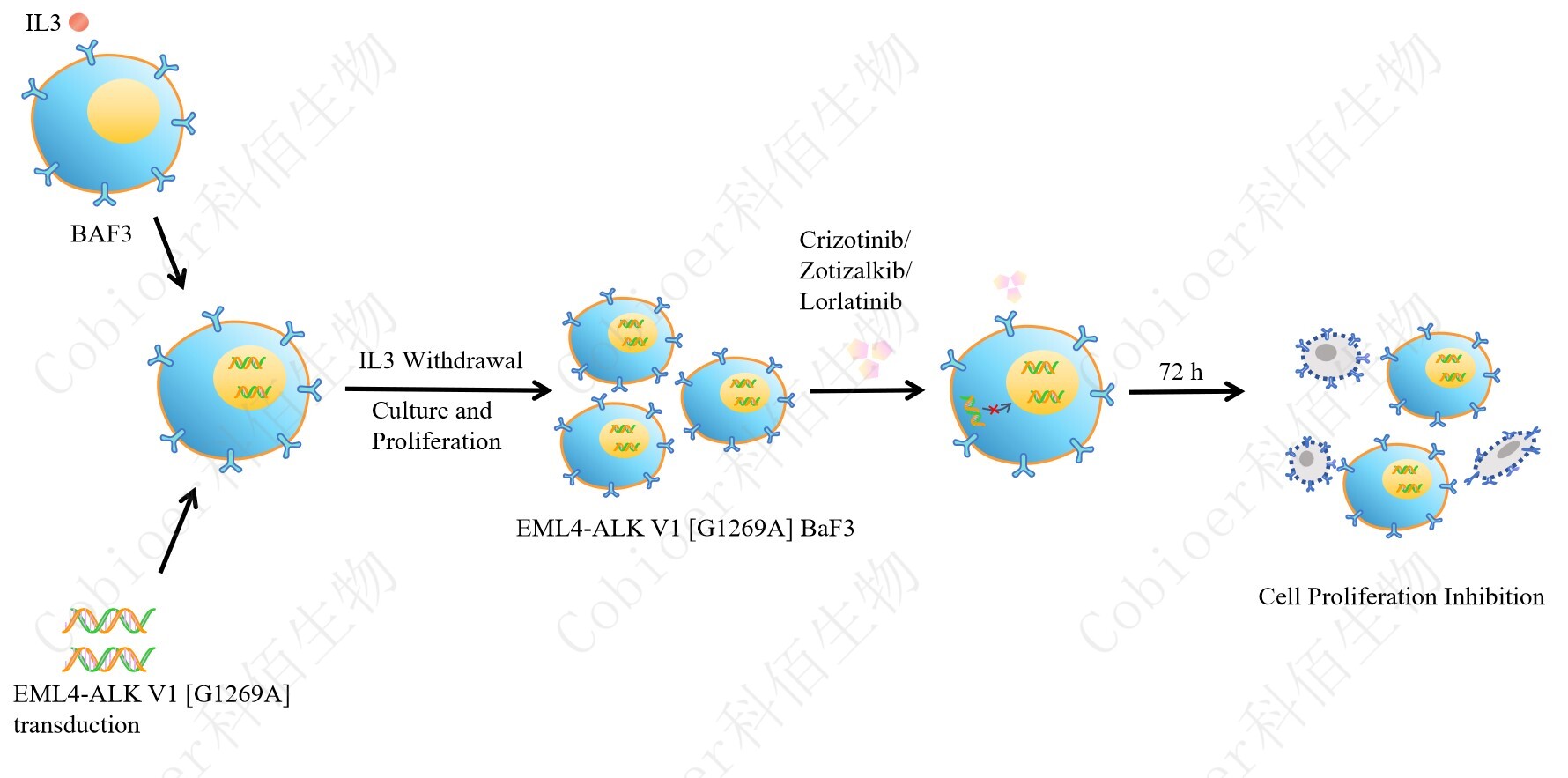 BaF3(小鼠原 B 細(xì)胞)的生長(zhǎng)和增殖需要 IL-3 的維持。通過(guò)引入各種表達(dá)激酶的基因, 能作為 BaF3 的驅(qū)動(dòng)基因,讓 BaF3 不再依賴 IL-3 而增殖,進(jìn)而激酶基因成為 BaF3 增殖依 賴的驅(qū)動(dòng)基因,用于評(píng)估小分子藥物對(duì)激酶的靶向抑制作用,原理及流程見(jiàn)下圖所示。