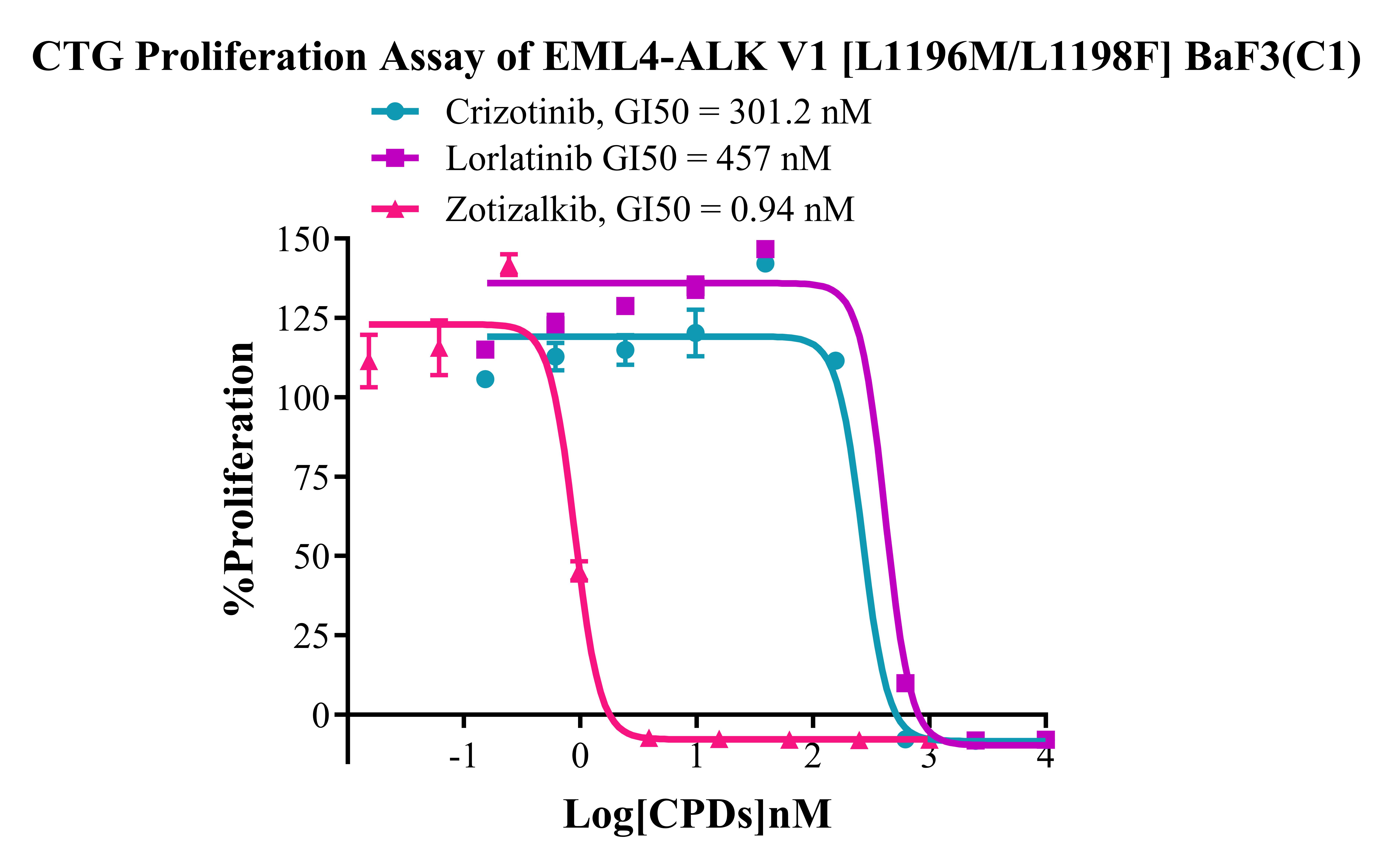 2. Anti-proliferation assay Figure 4. CTG Proliferation Assay of EML4-ALK V1 [L1196M/L1198F] BaF3(C1). |