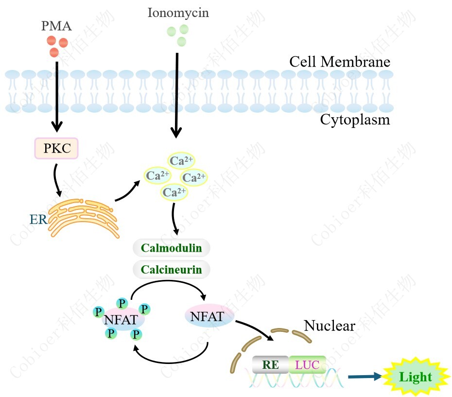 NFAT-Luc HEK293 報(bào)告基因藥靶模型很好的模擬了體內(nèi) NFAT 的信號(hào)轉(zhuǎn)導(dǎo)過(guò)程,原理見下圖所示。 ![]() Figure 1. NFAT-Luc HEK293 細(xì)胞模型原理圖 |