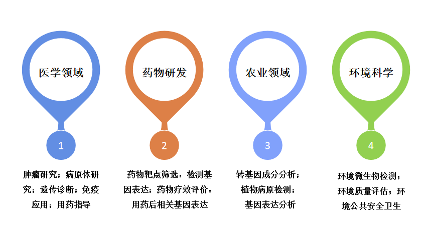 實(shí)時(shí)熒光定量PCR具有靈敏度高、特異性強(qiáng)、快速高效的特點(diǎn),廣泛應(yīng)用于生物醫(yī)藥、臨床診斷、農(nóng)業(yè)、環(huán)境科學(xué)等多個領(lǐng)域,常用于檢測基因表達(dá)、基因變異、轉(zhuǎn)基因等。