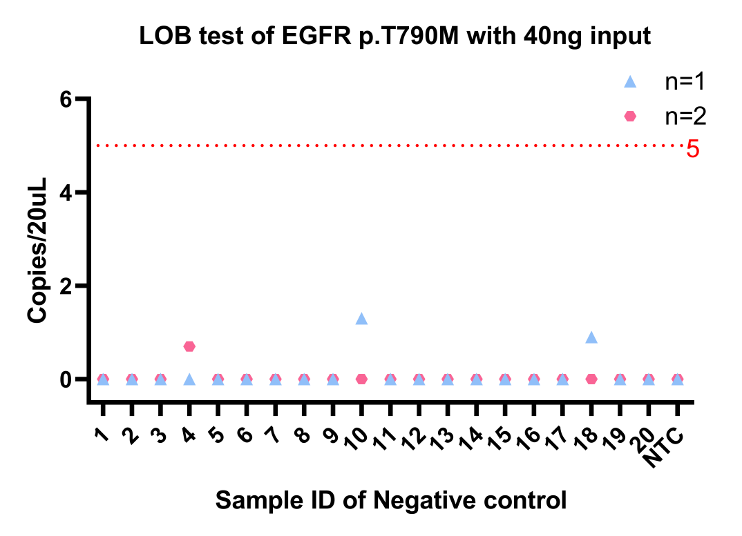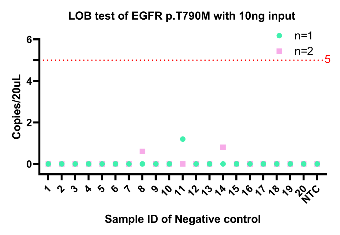 首先使用EGFR T790M的對(duì)應(yīng)的陰性標(biāo)準(zhǔn)品,對(duì)50%的標(biāo)準(zhǔn)品進(jìn)行有限稀釋,每個(gè)梯度使用陰性樣本兩倍稀釋,接著對(duì)11個(gè)樣本進(jìn)行檢測(cè)。