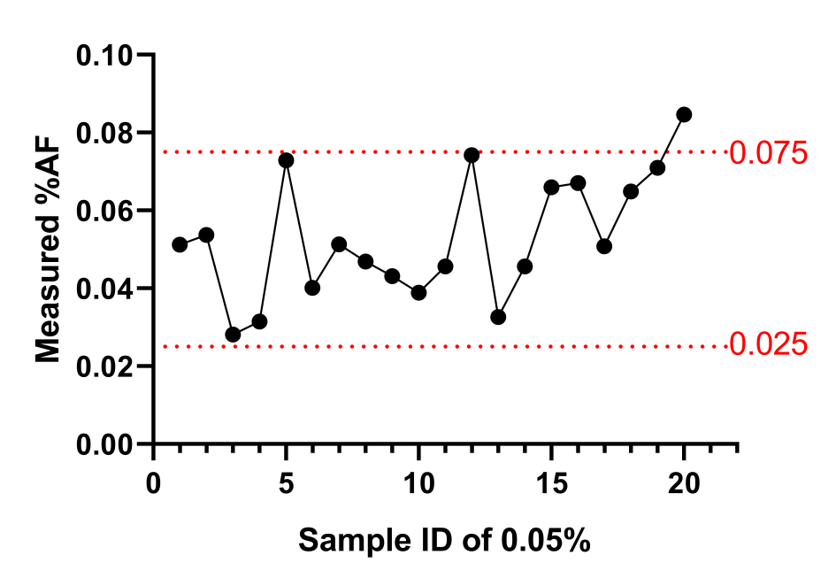 對(duì)20個(gè)0.05%的樣本進(jìn)行數(shù)字PCR檢測(cè),觀察在0.025-0.075%以內(nèi)是否達(dá)成95%檢出。