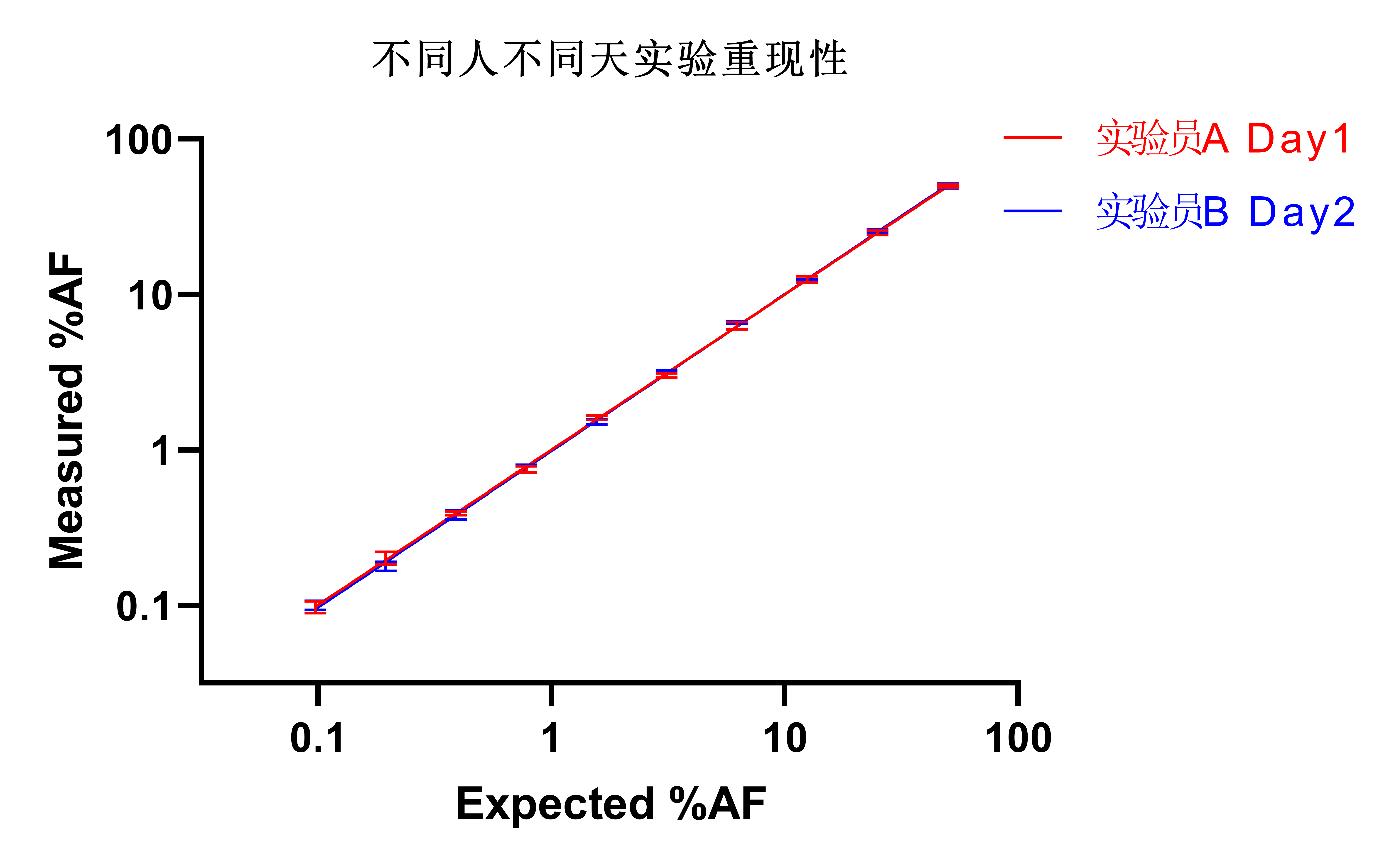 取10個(gè)不同AF(1%~50%)的標(biāo)準(zhǔn)品樣本,分別安排實(shí)驗(yàn)員A、實(shí)驗(yàn)員B在同一天,每人進(jìn)行四次檢測(cè)。