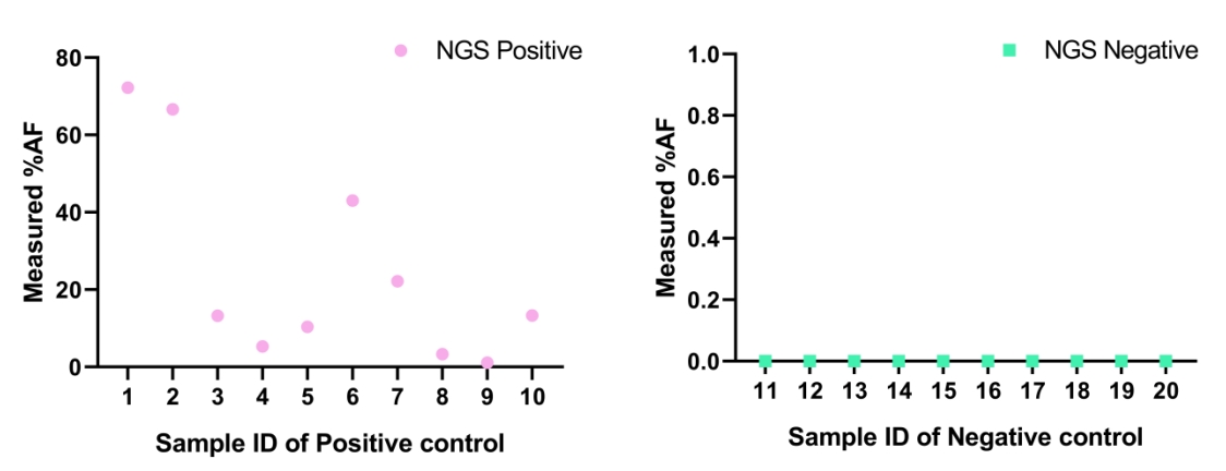 ①測(cè)試10個(gè)NGS陽性樣本,檢測(cè)結(jié)果均為陽性,陽性符合率100%,并定量檢出變異頻率。
