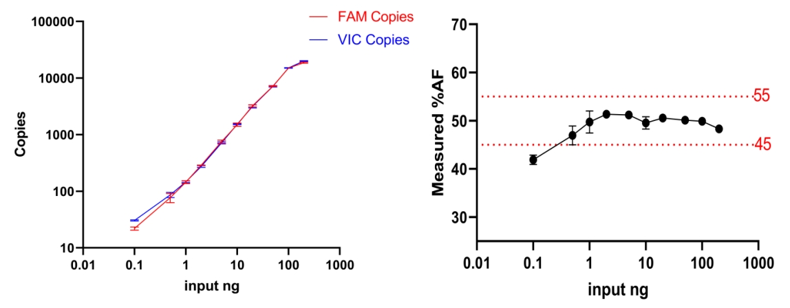 1.2 投入量在0.1ng~200ng間設(shè)置10個(gè)梯度,進(jìn)行數(shù)字PCR檢測(cè)(2復(fù)孔),判斷是否滿足%AF=50±10%波動(dòng)。