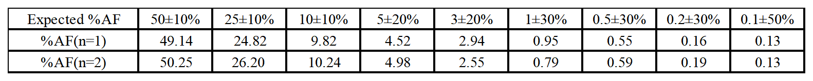 我們可以通過理論計(jì)算來預(yù)測(cè)下可能的檢測(cè)限范圍。當(dāng)控制拷貝在15000(對(duì)應(yīng)50ng input)以內(nèi)時(shí)LOB數(shù)據(jù)是2,2/15000=0.0133%,預(yù)測(cè)檢測(cè)限為0.0200%。