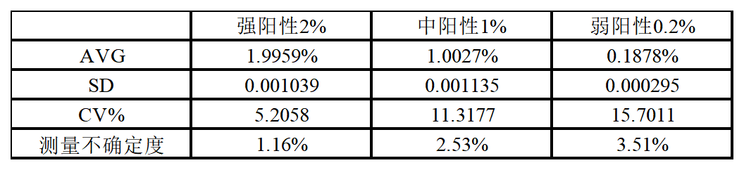 由上數(shù)據(jù)可見:強(qiáng)陽性2% 、中陽性1% 、弱陽性0.2%三種檢測(cè)體系下,誤差均在合理的范圍內(nèi),精密度良好。