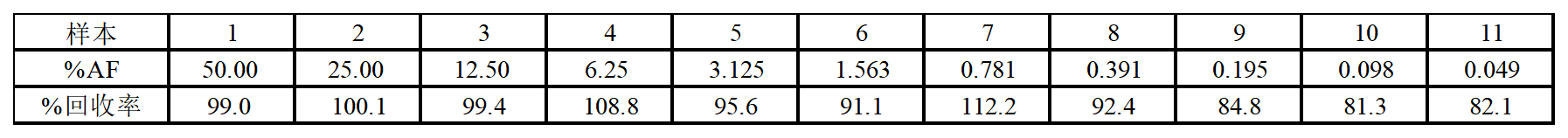 由上數(shù)據(jù)可見:當(dāng)AF在0.05%-50%范圍內(nèi),對(duì)應(yīng)的回收率在80-120%范圍,符合預(yù)期。
