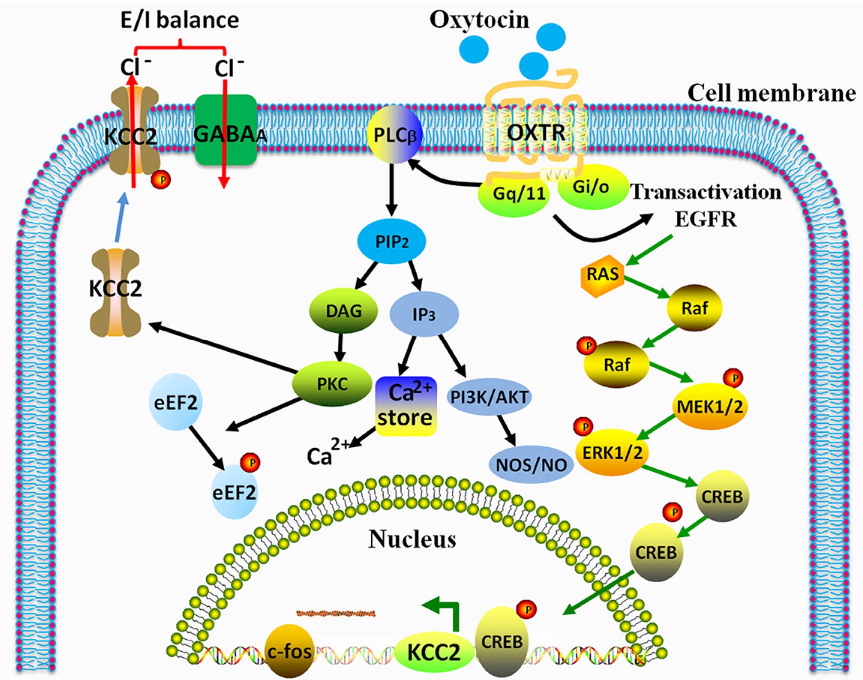催產(chǎn)素(OXT)是大腦中由下丘腦室旁核(PVN)和視上核(SON)產(chǎn)生的神經(jīng)肽,主要作為外周系統(tǒng)中的激素,可促進母乳喂養(yǎng)時的乳汁分泌,調(diào)節(jié)分娩時的子宮收縮,緩解疼痛和促進分娩過程,促進傷口愈合。此外,中樞神經(jīng)系統(tǒng)(CNS)中的 OXT 系統(tǒng)在社會認可、社交行為、焦慮相關行為和自主神經(jīng)功能中起著重要作用,例如母體行為、攻擊性、交配、依戀和性行為。除了促社會效應外,OXT 還被確定為大腦中重要的抗應激和抗焦慮因子,通過其靶受體(催產(chǎn)素受體,OXTR)激活細胞內(nèi) MEK/ERK 信號傳導。