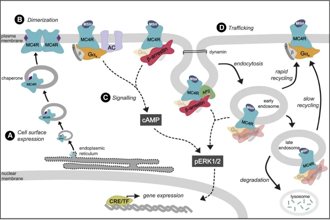 MC4R (黑皮質(zhì)素4受體) 是黑皮質(zhì)素受體家族成員之一,其家族屬于視紫紅質(zhì)樣A類GPCR,成員還包括:MC1R、MC2R、MC3R和MC5R。黑皮質(zhì)素受體 (MC1R-MC5R) 位于多種細胞類型上,并遍布大多數(shù)身體系統(tǒng)。MC4R是中樞黑皮質(zhì)素系統(tǒng)的重要組成部分,主要在下丘腦室旁核(PVH)中表達,是一種A類GPCR。在高能量平衡狀態(tài)下,阿片黑皮質(zhì)素原 (POMC) 神經(jīng)元釋放多肽MC4R激動劑-α-黑素細胞刺激激素(α-MSH)。α- MSH與MC4R結合會激活MC4R信號傳導,抑制食欲和食物攝入。在低能量平衡狀態(tài)下,下丘腦室旁核中釋放AgRP (agouti-related peptide)。AgRP作為MC4R與α- MSH結合的競爭性拮抗劑,也是MC4R反向激動劑,抑制MC4R信號傳導。