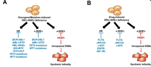 “合成致死”是指兩個非致死基因同時被抑制,導致細胞死亡的現(xiàn)象。當兩個基因同時失活導致細胞死亡,但任一基因中的單獨失活都是無明顯毒性。在發(fā)生突變失活的腫瘤中,通過抑制其合成致死配對基因,可獲得腫瘤選擇性殺死。