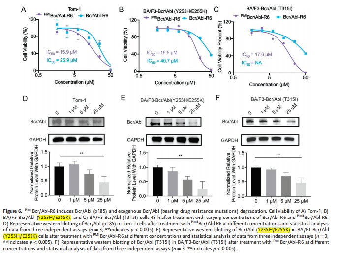 科佰生物為客戶提供了BCR-ABL1 [Y253H/E255K]/BaF3(貨號CBP73326)和BCR-ABL1 [T315I]/BaF3(貨號CBP73190)產(chǎn)品,幫助客戶在細胞活性測定中對其細胞活力測定,判斷PMIBcr/Abl-R6對細胞的殺傷能力和降解能力,通過對不同濃度的PMIBcr/Abl-R6處理的細胞系代表性蛋白印跡的測定與分析,從而助力研究過程中PMIBcr/Abl-R6誘導(dǎo)Bcr/Abl p185和外源性表達的Bcr/Abl攜帶耐藥性突變。