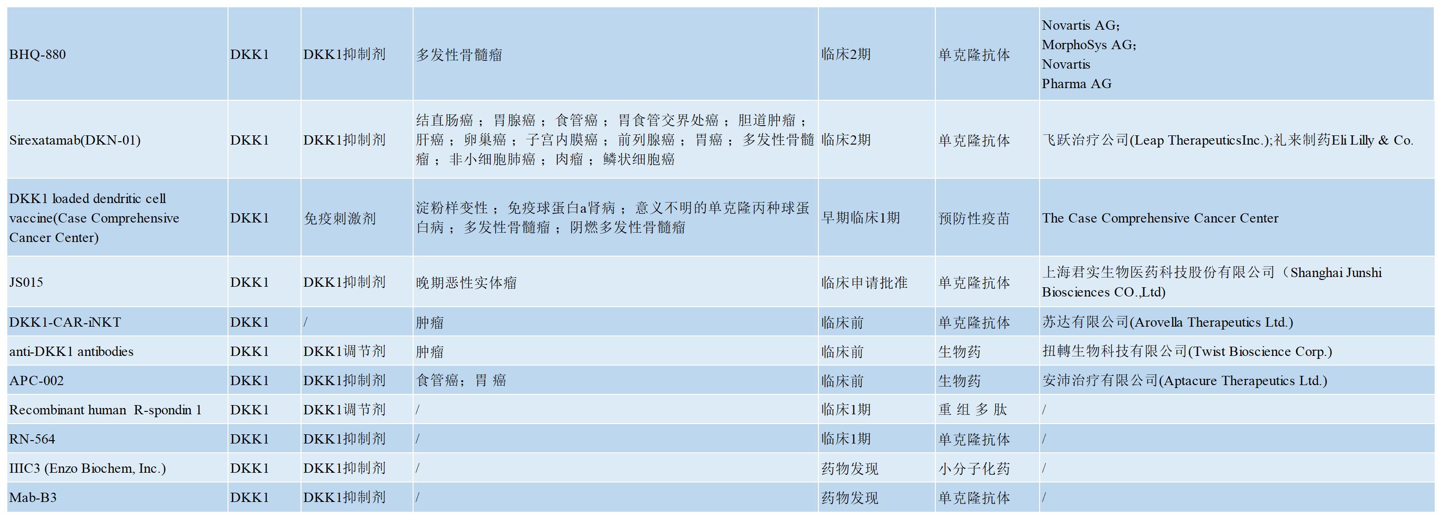 DKK1具有調節(jié)免疫的特性,它對免疫系統(tǒng)的抑制作用使其成為免疫治療的一個有前景的靶點。此前,Leap Therapeutics開發(fā)了抗DKK1中和抗體DKN-01并在晚期胃食管交界處和胃癌癥(GEJ/GC)以及婦科癌癥的I期或II期試驗中進行了評估,其方案包括與紫杉醇或pembrolizumab的單藥治療和聯(lián)合治療比較,值得注意的是,患有Wnt信號突變的婦科癌癥患者可以從DKN-01治療中獲益。GEJ/GC的另一項正在進行的臨床研究也表明,在腫瘤表達高水平DKK1(DKK1高)的患者中生存率和客觀反應結果都有所提高;非常令人鼓舞的結果表明,DKN-01加Keytruda治療可使中位無進展生存期(PFS)超過22周,中位總生存期(OS)接近32周,在既往未接受抗PD-1/PD-L1治療的DKK1高GEJ/GC患者中,ORR為50%,疾病控制率(DCR)為80%;在對PD-1/PD-L1治療難治的6名GEJ/GC患者中,3名血清DKK1水平高的患者病情穩(wěn)定,而3名血清DKK1水平低的患者病情則發(fā)生進展。這些結果表明,DKK1抑制治療顯著改善了血清DKK1水平高的患者的療效,并由此得出在DKK1高表達腫瘤患者中使用DKK1抑制劑和PD1/PDL-1免疫檢查點聯(lián)合治療的方案是一種獲得更好療效的策略。目前已有多個DKK1抑制劑處于研發(fā)階段,其中多數(shù)為DKK1的中和抗體,也有少量的小分子及重組多肽,小核酸藥物等( 如下表所示)。