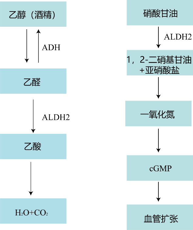 ALDH2(acetaldehyde dehydrogenase 2),線粒體乙醛脫氫酶2,位于第12號染色體的12q24.2位置,全長43,438bp,共有15個外顯子,編碼由517個氨基酸殘基組成的蛋白質。ALDH2是人體催化硝酸甘油生物轉化的主要途徑,該酶同時具有脫氫酶和酯酶的催化活性,其酯酶活性可以通過將硝酸甘油脫硝產(chǎn)生NO,進而引起血管擴張。