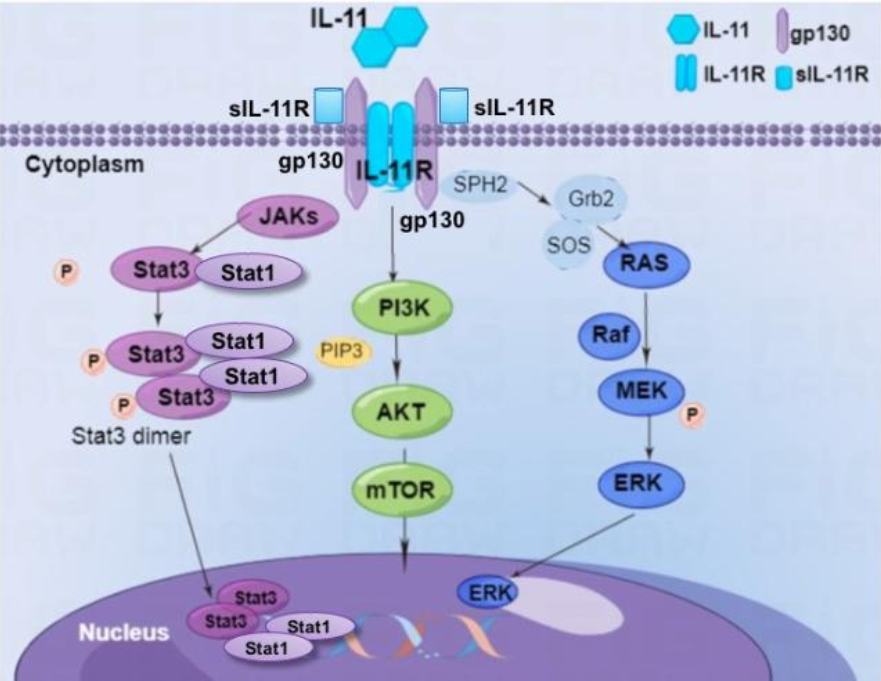 JAK/STAT信號(hào)通路是IL-11最廣為人知的下游信號(hào)通路。IL-11信號(hào)轉(zhuǎn)導(dǎo)涉及GP130,由STAT3的激活和相對(duì)低水平的STAT1介導(dǎo)。在IL-11與其受體結(jié)合后,JAK與適配蛋白形成復(fù)合物。STATs隨后被酪氨酸磷酸化,導(dǎo)致其二聚化并與受體復(fù)合物分離?;罨腏AK激酶可導(dǎo)致酪氨酸磷酸化和STAT家族轉(zhuǎn)錄因子的刺激。IL-11可誘導(dǎo)酪氨酸磷酸化STAT3和STAT1,但后者在較高濃度下以劑量依賴性的方式發(fā)生。STAT在特定酪氨酸殘基上被JAK磷酸化,并且STAT同二聚體和異二聚體通過(guò)SH2結(jié)構(gòu)域?qū)?。磷酸化的STATs二聚化,轉(zhuǎn)運(yùn)到細(xì)胞核中,并觸發(fā)靶基因的轉(zhuǎn)錄調(diào)節(jié)。