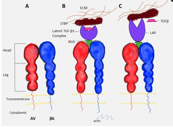 整合素αvβ6特異的配體主要配體包括細(xì)胞外基質(zhì)蛋白如纖維連接蛋白(Fibronectin)、層粘連蛋白(Laminin)以及潛活形式的TGF-β。潛伏期相關(guān)肽(LAP)是轉(zhuǎn)化生長因子β(TGF-β)前體肽的氨基末端結(jié)構(gòu)域,形成潛在的 TGF-β 復(fù)合物,并充當(dāng)整合素 αvβ6 的配體。當(dāng)整合素 αvβ6 通過LAP與細(xì)胞外位點(diǎn)的潛在TGF-β復(fù)合物結(jié)合時,同時與細(xì)胞內(nèi)細(xì)胞骨架結(jié)合時,活性TGF-β從潛在復(fù)合物中釋放出來,驅(qū)動纖維化和免疫抑制微環(huán)境形成;此外,αvβ6還可作為口蹄疫病毒(FMDV)等病原體的入侵受體。